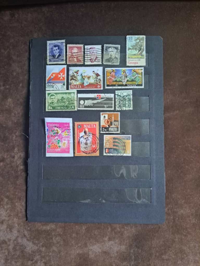 مجموعه ای شامل 15 تمبر متفاوت از کشورهای جهان مهرخوره و مهر نخورده، روی کاغذ و جدا از کاغذ برابر تصویر