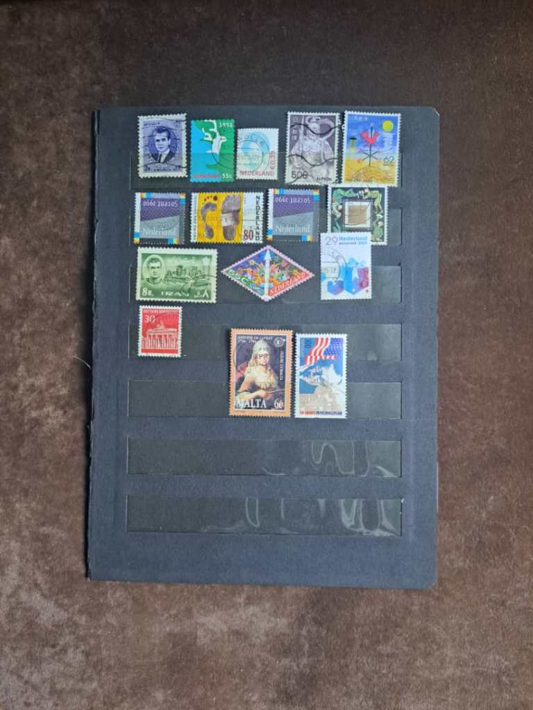 مجموعه ای شامل 15 تمبر متفاوت از کشورهای جهان مهرخوره و مهر نخورده، روی کاغذ و جدا از کاغذ برابر تصویر
