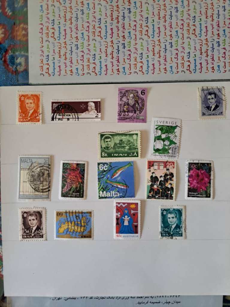 مجموعه ای شامل 15 تمبر متفاوت از کشورهای جهان مهرخوره و مهر نخورده، روی کاغذ و جدا از کاغذ برابر تصویر