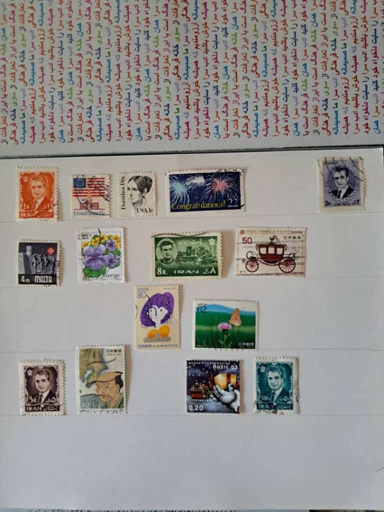 مجموعه ای شامل 15 تمبر متفاوت از کشورهای جهان مهرخوره و مهر نخورده، روی کاغذ و جدا از کاغذ برابر تصویر