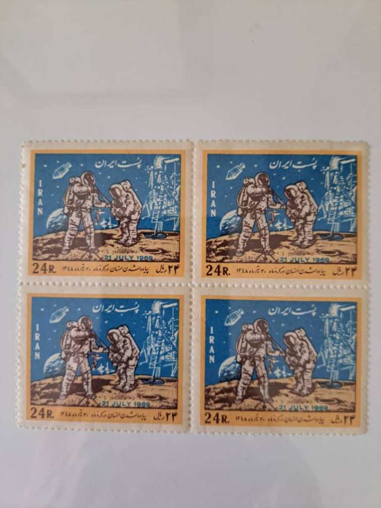 شرح کالا: تمبر یادگاری نشستن انسان روی کره ماه در سال 1348 در بلوک جهارتایی