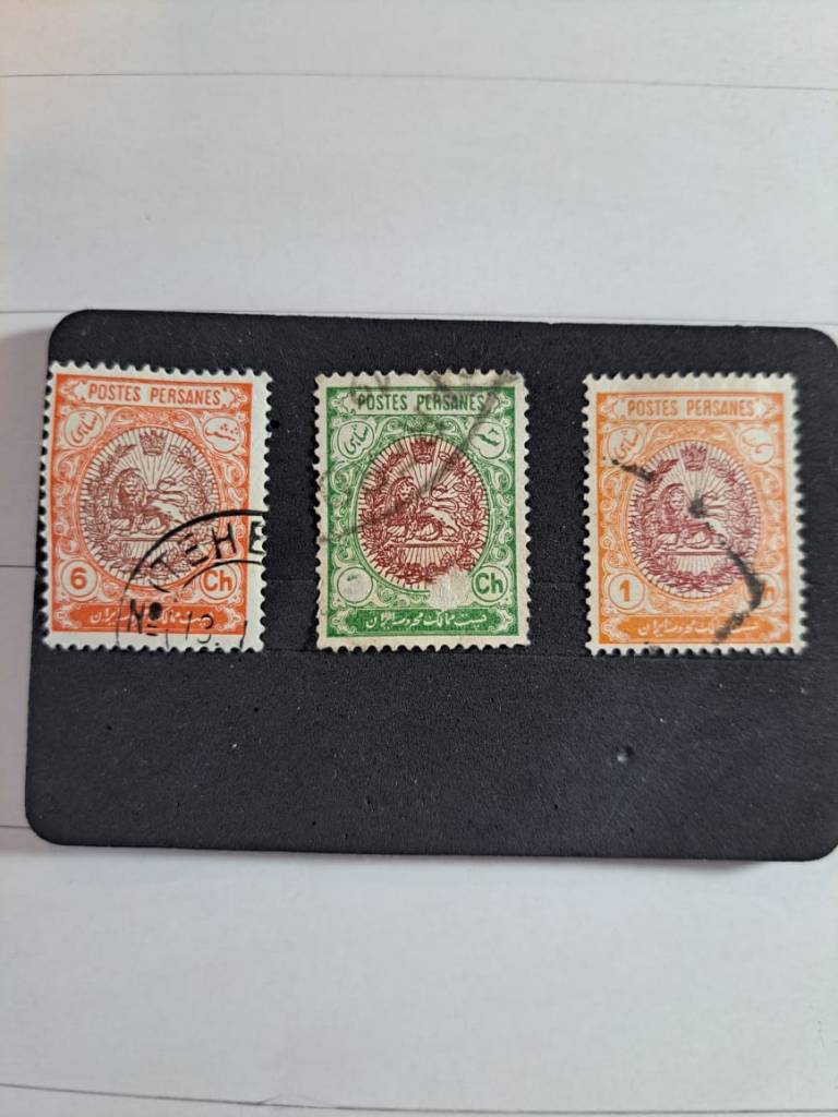 شرح کالا: تمبر 1 شاهی و 3 شاهی و 6 شاهی شیروخورشید مشروطه سال 1288