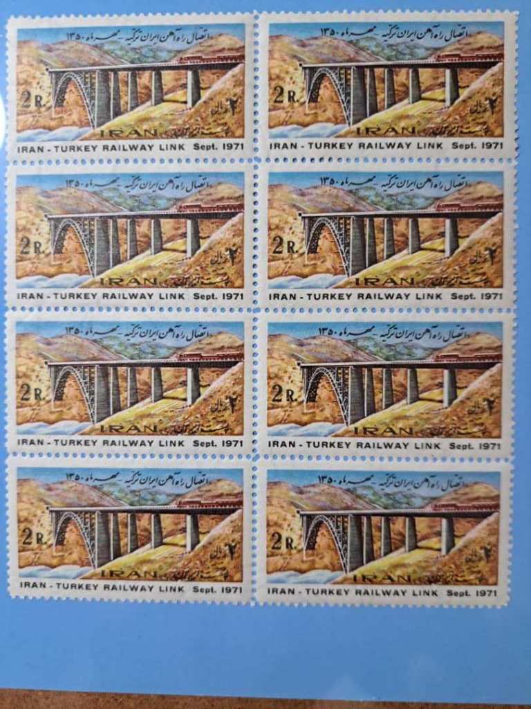 شرح کالا: دو بلوک تمبر یادگاری اتصال راه آهن ایران-ترکیه در سال 1350