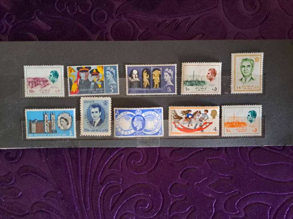 این بسته مجموعه ای شامل 10 تمبر نوی بعضاً بسیار کمیاب و پر ارزش متفاوت ازایران و انگلیس برابر تصویر است