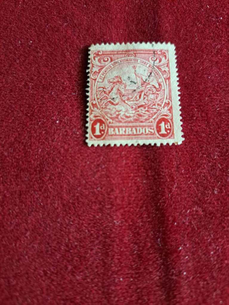 شرح کالا: تمبر1 پنس قرمز با تصویر مهر باربادوس مستعمره انگلیس در زمان جرج ششم. منتشر شده در 1938. شماره تمبر در کاتالوگ اسکات 194