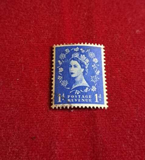 تمبر یک پنس انگلیس (1956-) برنگ آبی سیر با تصویر ملکه الیزابت دوم