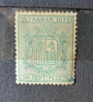 تمبر کمیاب چاپ شده در سال ۱۸۷۵ با نشان امپراتوری استعماری اسپانیا، اولترامار. شماره اسکات ۶۵