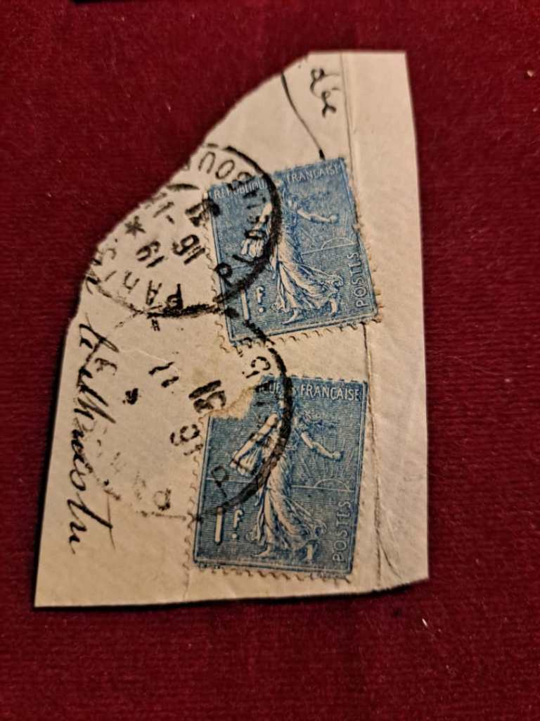 دو عدد تمبر یک فرانک فرانسهسال 1903. اسکات # 154 روی کاغذ.