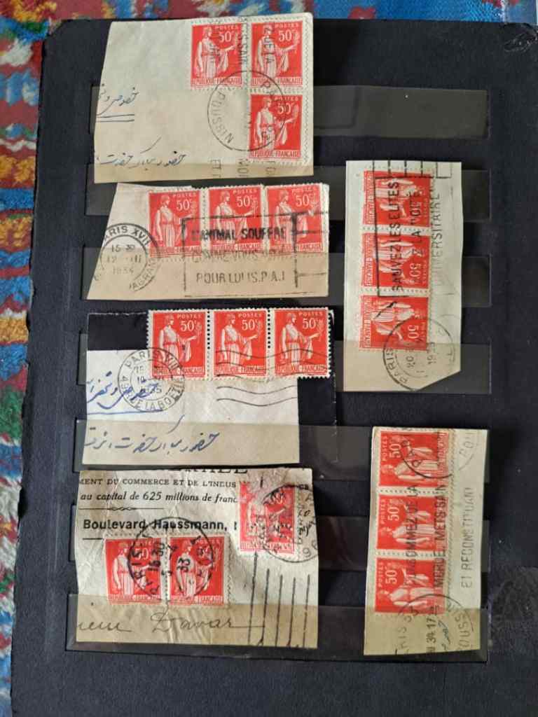 هیجده عدد تمبر 50 سانتیم فرانسه برنگ قرمز. شماره اسکات 267 روی کاغذ. پست شده از فرانسه برای علی اکبر داور وزیر مالیه ایران در دهه 1930.