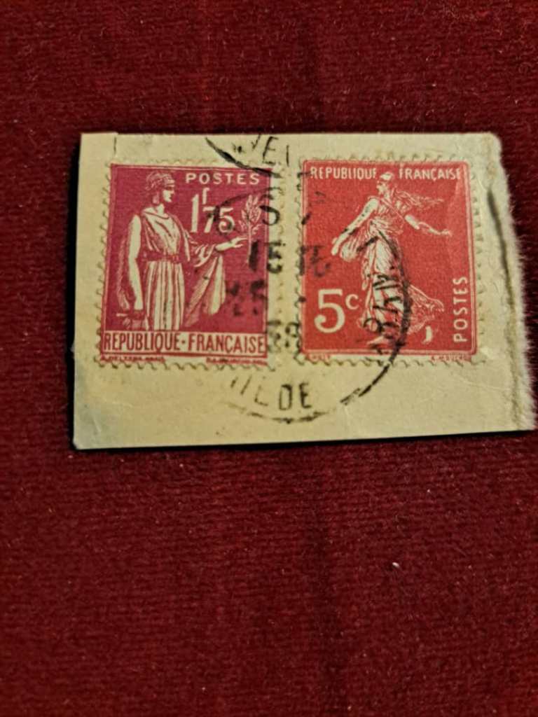 تمبر یک فرانک و 75 سانتیم فرانسه برنگ سیکلمه. تیپ سوور. شماره اسکات 283 و تمبر 5 سانتیم برنگ گریز شماره اسکات 161روی کاغذ.