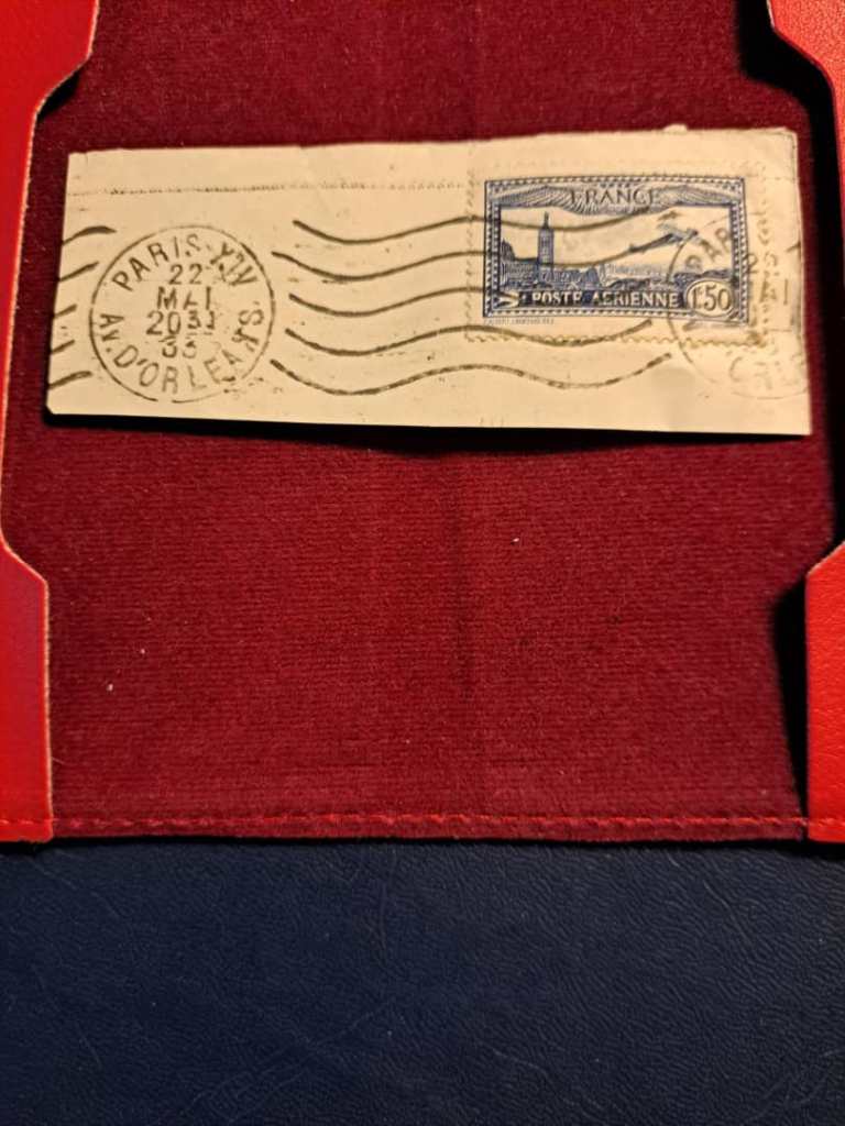 تمبر یک فرانک و 50 سانتیم فرانسه پست هوایی برنگ آبی سیر روی کاغذ.