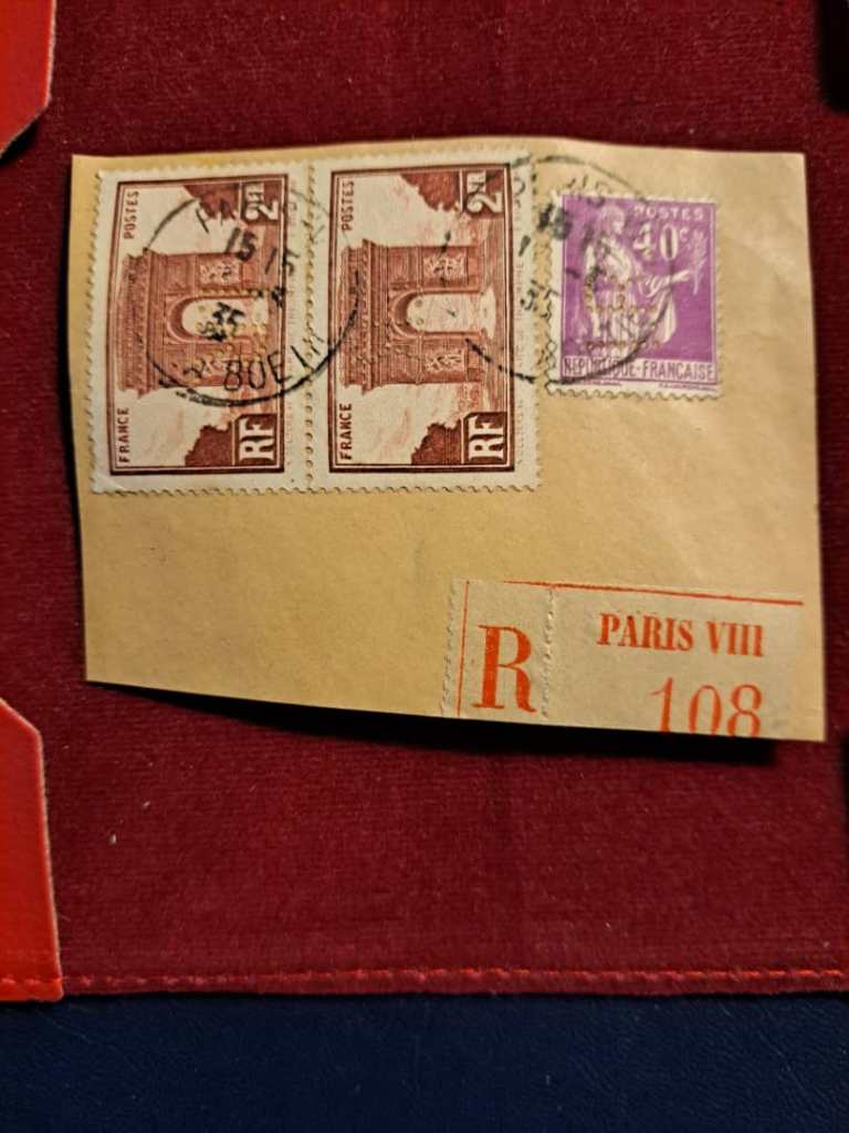 2 عدد تمبر 2 فرانک فرانسه با تصویر قوس پیروزی برنگ قهوه ای قرمز اسکلت شماره 263 و یک عدد تمبر 40 سانتیم بنفش. اسکات شماره 265 . رو کاغذ.