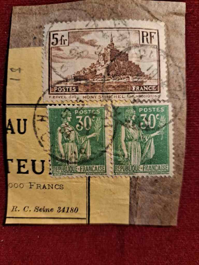 تمبر 5 فرانک فرانسه برنگ قهوه ای اسکات شماره 2249 و 2 عدد تمبر 30 سانتیم سبز. اسکات شماره 264 . رو کاغذ.