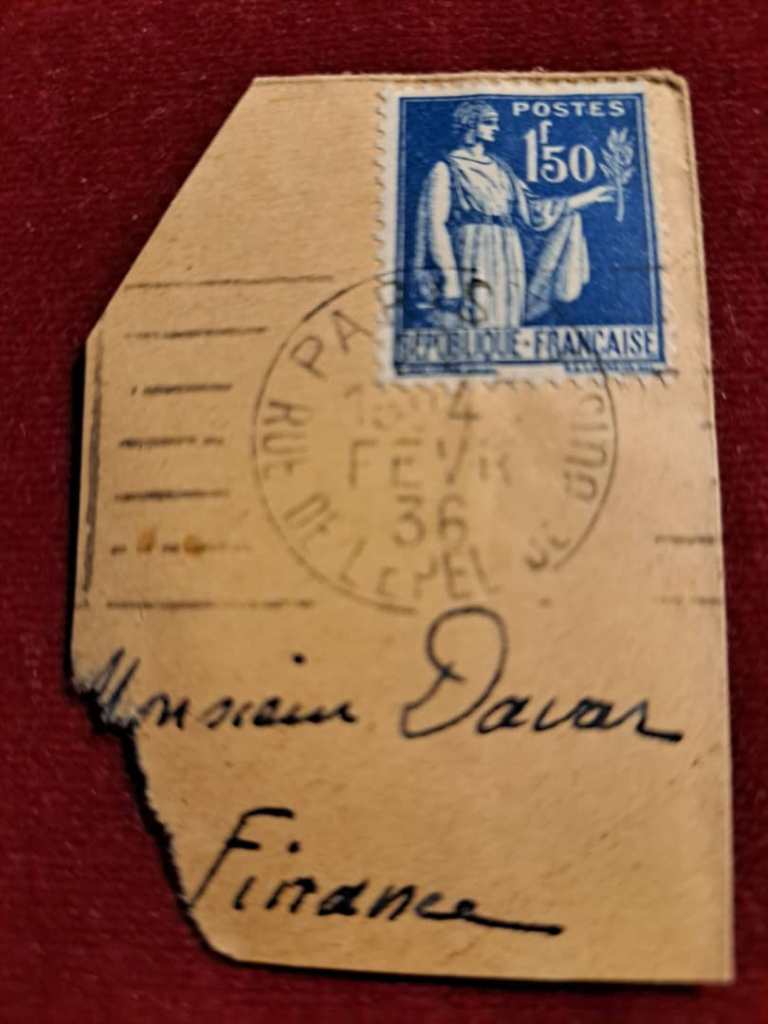 تمبر یک فرانک و 50 سانتیم آبی فرانسه. شماره اسکات 282. از نامه ای برداشته شده که از فرانسه برای علی اکبر داور وزیر مالیه ایران فرستاده شده بوده است.
