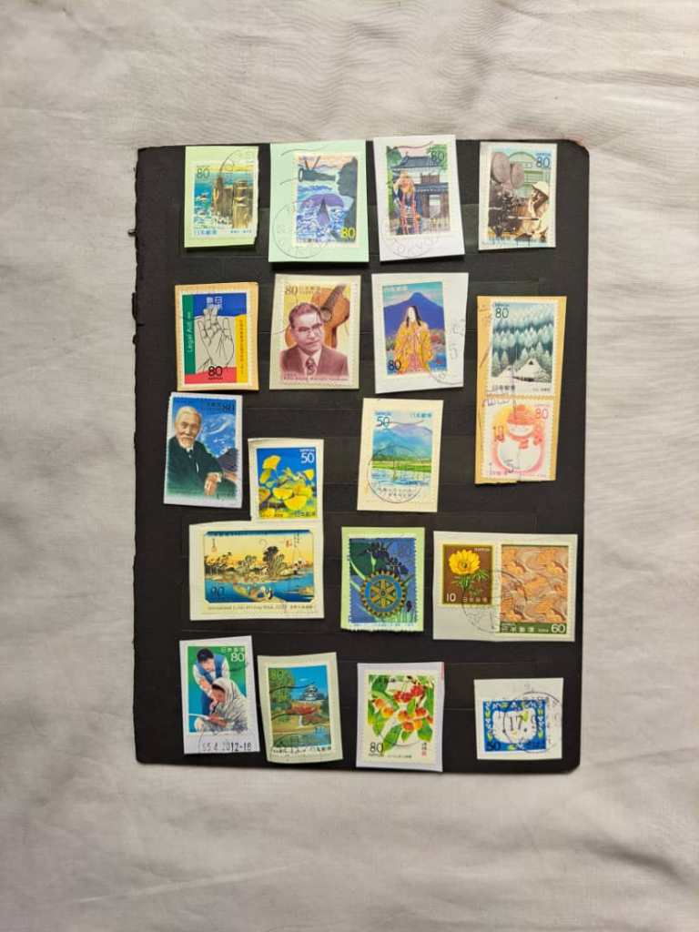 مجموعه ای از تمبرهای با ارزش ژاپن. واریته خوبی از مهرهای باطل کننده تمبر در ادارات ژاپن.