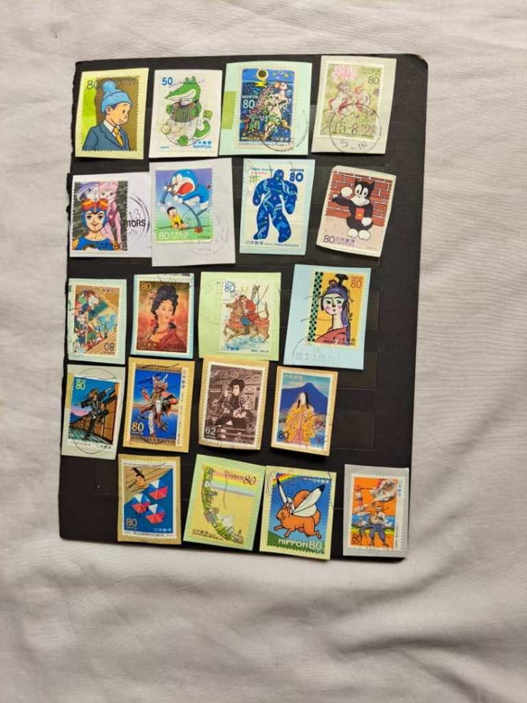 مجموعه ای از تمبرهای با ارزش ژاپن. واریته خوبی از مهرهای باطل کننده تمبر در ادارات ژاپن.