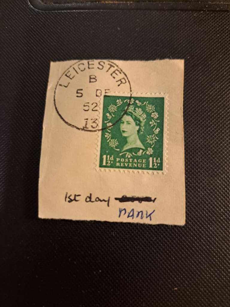 تمبر ویلدینگ 1 پنس و نیم انگلیس برنگ سبز با مهر ابطال در اولین روز انتشار، روز پنجم دسامبر 1952