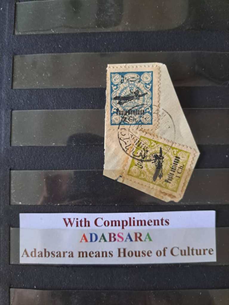 تمبر های یک شاهی و دو شاهی مالیه با سورشارژ پست هوایی بخط نستعلیق روی کاغذ با مهر باطل مدور روی کاغذ