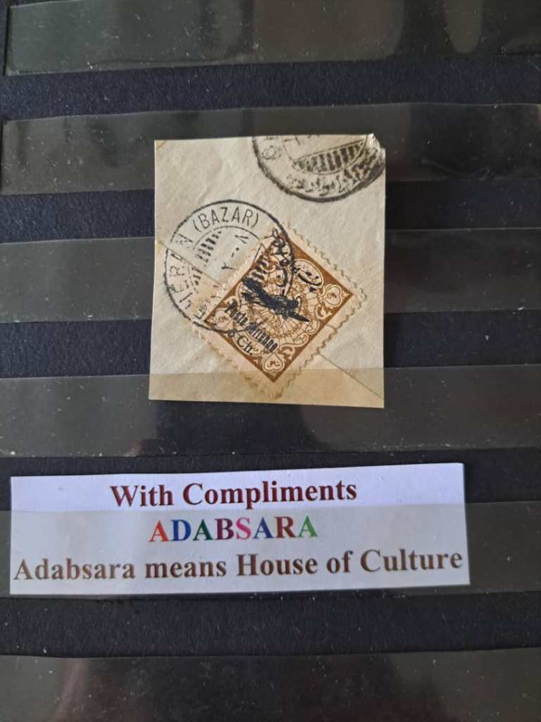 تمبر مالیه 10 شاهی با سورشارژ پست هوایی بخط نستعلیق روی کاغذ با مهر باطل مدور روی کاغذ