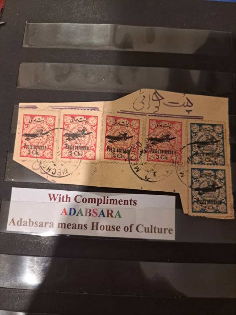 تمبرهای 2 شاهی(2عدد) و 3شاهی (4 عدد) مالیه با سورشارژ پست هوایی. روی بخشی از پاکت. مورد استفاده در سالهای 1307 و 1308