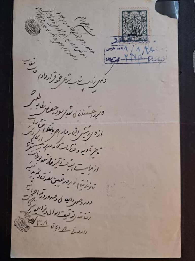 تمبر یک شاهی عدلیه در روی سندی در تاریخ هشتم آبان 1308