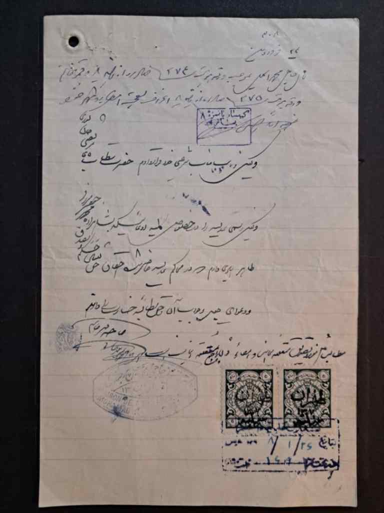 2 عدد تمبر ده شاهی عدلیه در روی سندی در تاریخ 26 فروردین 1308