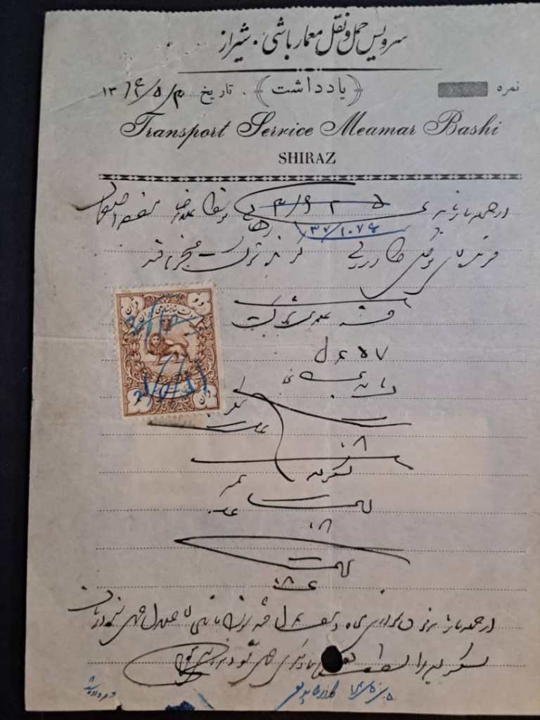 یک عدد تمبر دو قران مالیه در روی بارنامه صادره سرویس حمل و نقل معمارباشی در شیراز در تاریخ 3 مرداد 1314