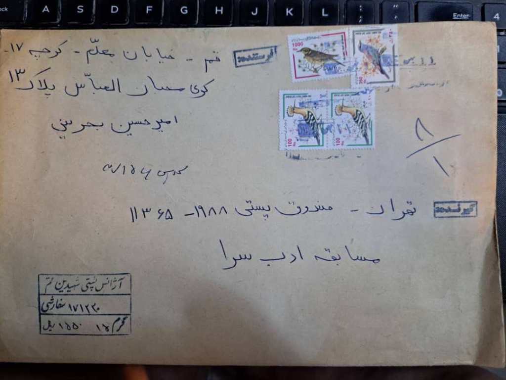 دو تمبر 1000 ریال و 2 تمبر 100 ریال روی پاکت سفارشی پست شده از قم به ادب سرا در تهران در روز 25 بهمن 1380